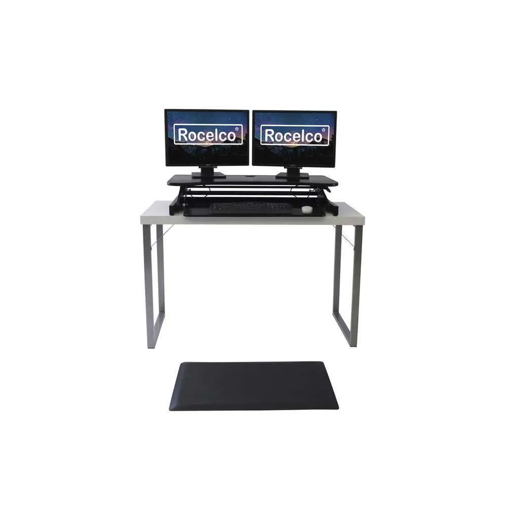The DADR Standing Desk Converter Bundle is the perfect way to get your ergonomic workstation started. It comes with a Black 37.5″ DADR Sit to Stand Desk Riser (R DADRB) and an anti fatigue mat (R MAFM) The deluxe DADR Sit to Stand Desk now features 20% greater range of motion and is a newer, wider version of the classic ADR desk riser that lets you hold two or three monitors and/or a laptop. It gives you the best of both worlds. You can sit part of the day, as you always have, but you can also stand and take advantage of all the health benefits that come with standing and moving around. You, and your associates, will become healthier and more productive. Your DADR uses your current desk??.no need to buy all new furniture. You can sit as you always do and then easily raise the large 37.5″ x 20.5″ desk and keyboard tray into an infinte amount of positions (up to 17″ above your regular desk). This standing desk converter is perfect for an office workstation, a medical desk, a home office or a student desk. The DADR is a sit to stand workstation that offers a 29″ wide x 11.5″ deep retractable keyboard tray that allows you to get into the most comfortable ergonomic position and it is large enough to hold a laptop computer (with other risers you may have to move the laptop or the entire riser every time you change from sitting to standing). It also includes a grommet hole for a single (Rocelco DM1) or double (Rocelco DM2) monitor arm or to organize cables. The DADR Ergonomic workstation provides gas piston lift assist that allows you to easily raise up to 35lbs. Completely assembled and ready to go! The included MAFM Anti-Fatigue Mat is designed to work in tandem with standing desk risers, like the Rocelco ADR, DADR, EADR, CADR and MSD series. It will help support your back, hips, knees and feet so you can get all the benefits of standing while you work. This versatile desk mat effectively ?reduces” your weight by 30% to make standing easier on your feet and joints. The advanced multi-layer construction offers a comfortable ?leather like” top surface, a memory foam inner layer and a non-slip bottom. A perfect 30″ x 20″ size provides plenty of room to move around, but still can fit into the kneehole of a standard desk or built-in when it is not being used. Beveled edges help to reduce tripping issues and ” commercial grade thickness provides hours of comfort and stability. The durable materials on this desk mat will not break down, even after years of use.